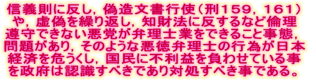 | 被害を受けた国民の怒りは,模倣者や悪徳弁理士に便宜を図った馬鹿者悪徳公務員に 対する処分請求として,日本政府にも向けられるのだ。そのことを忘れるべきでない。 |