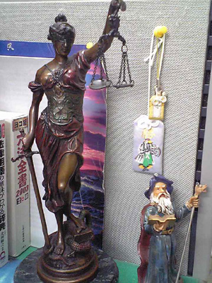| 18年以上のつきあい・・・私の精神の支え,見守ってくれる法の女神。 片隅には,大石内蔵助良雄の勝守り。正義にはこれが効く! |